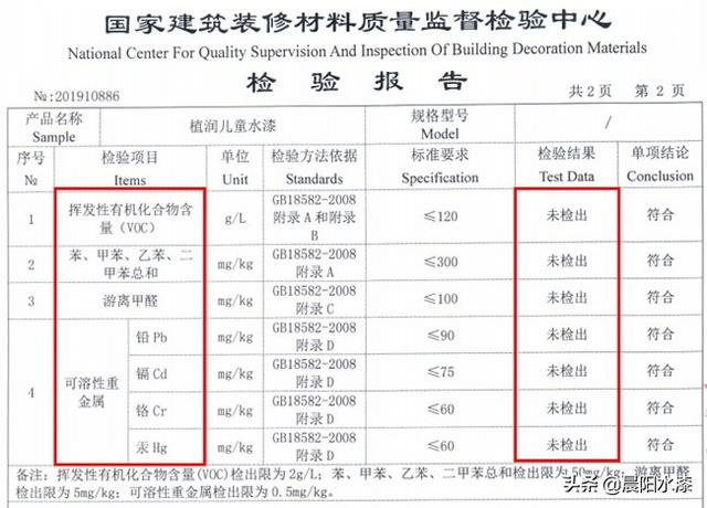 晨陽水漆的兒童漆產品——植潤兒童水漆在國家建筑裝修材料質量監督檢驗中心提供的檢測報告中各項有害物質(VOC、苯類物質、游離甲醛、重金屬等)的檢驗結果為未檢出,完全優于兒童漆標準。