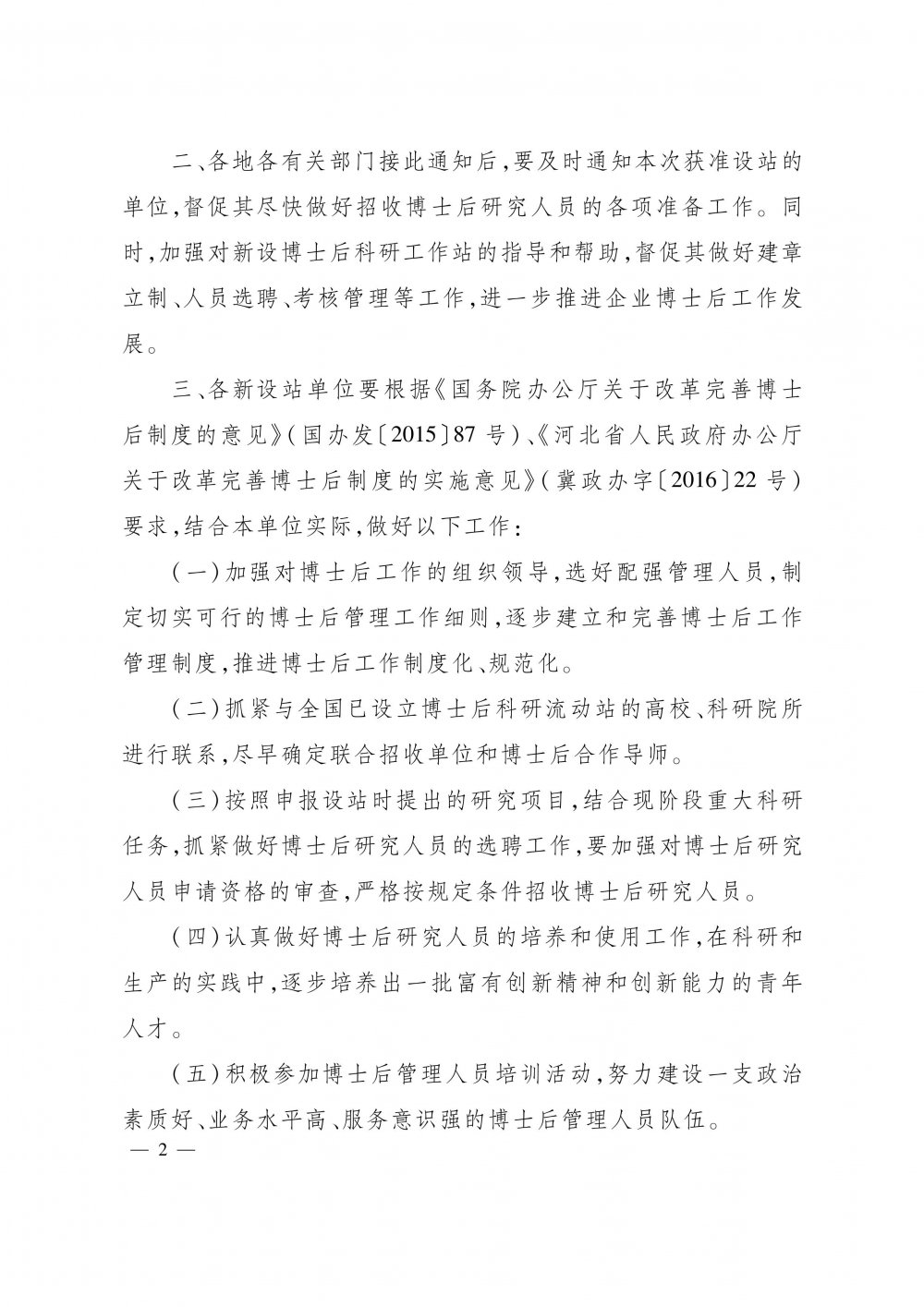 此次河北省被批準設立博士后科研工作站的16個單位分別為河北華清環境科技集團股份有限公司、河北威遠生物化工有限公司、石家莊天泉良種奶牛有限公司、秦皇島市山海關藥業有限責任公司、秦皇島佰工鋼鐵有限公司、唐山海都水產食品有限公司、唐山市國亮特殊耐火材料有限公司、廊坊經濟技術開發區管理委員會、河北京南·固安高新技術產業開發區管理委員會、河北晨陽工貿集團有限公司、保定市第一中心醫院、河北廣祥制藥有限公司、中國雄安集團生態建設投資有限公司、河北省中醫院、河北省食品檢驗研究院、國網河北省電力有限公司。